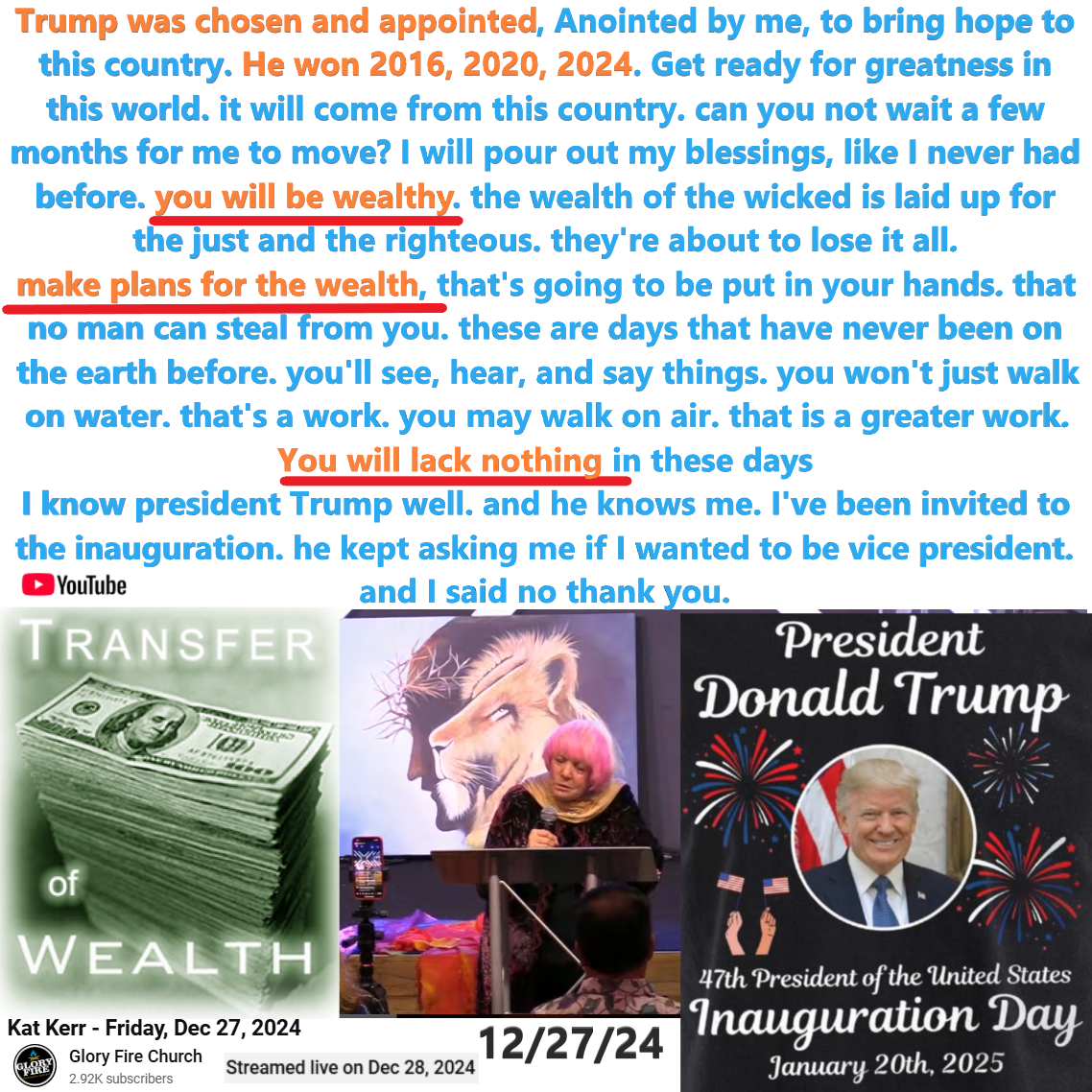 Trump was chosen and appointed, Anointed by me, to bring hope to this country. He won 2016, 2020, 2024. Get ready for greatness in this world. it will come from this country. can you not wait a few months for me to move? I will pour out my blessings, like I never had before. you will be wealthy. the wealth of the wicked is laid up for the just and the righteous. they’re about to lose it all. make plans for the wealth, that’s going to be put in your hands. that no man can steal from you. these are days that have never been on the earth before. you’ll see, hear, and say things. you won’t just walk on water. that’s a work. you may walk on air. that is a greater work. You will lack nothing in these days. I know president Trump well. and he knows me. I’ve been invited to the inauguration. he kept asking me if I wanted to be vice president. and I said no thank you.