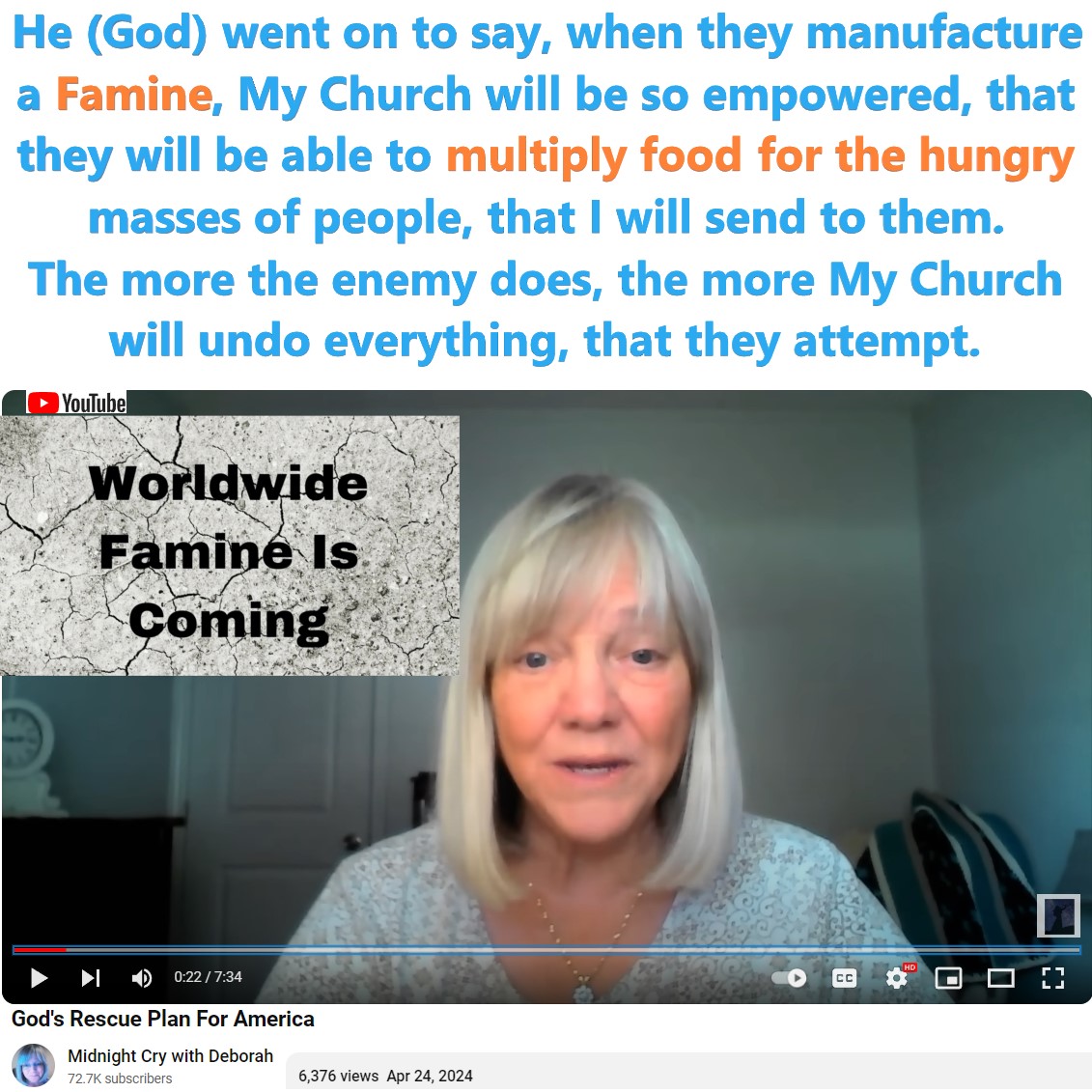 You will Multiply Food during Famine. Prophecy by Midnight Cry with Deborah on 4/24/24. See partial transcript and video link below:
