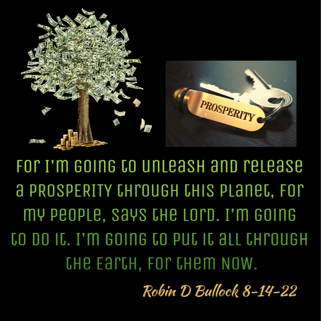 For I’m going to unleash and release a PROSPERITY through this planet, for My people, says the Lord. I’m going to do it. I’m going to put it all through the Earth, for them NOW. (Robin D Bullock 8-14-22)