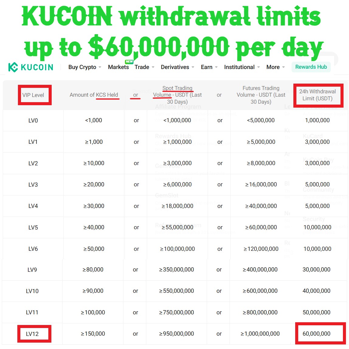 Level 12 VIP allows for 24H withdrawal limit of $60 million USDT. This requires holding 150,000 KCS tokens (costs about $1.6 million USD as of 3/18/25), OR, having $950 million dollars of 30 day trading activity.