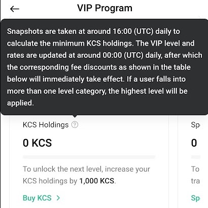 Snapshots are taken at around 16:00 (UTC) daily to calculate the minimum KCS holdings. The VIP level and rates are updated at around 00:00 (UTC) daily, after which the corresponding fee discounts as shown in the table below will immediately take effect. If a user falls into more than one level category, the highest level will be applied.