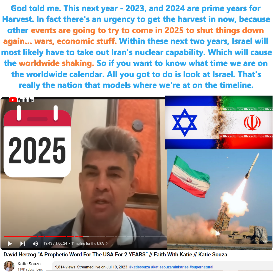 - Future Shifting: He predicts that within the next two years, Israel may need to address Iran’s nuclear capabilities, which he believes will cause a “worldwide shaking” and trigger further harvests as people turn to God in fear and seeking truth.