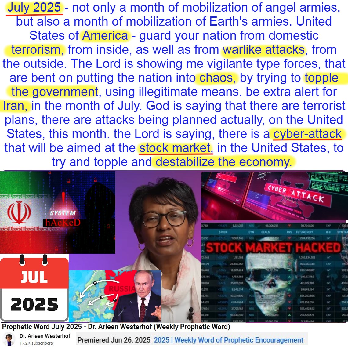 July 2025 WARNING! Stock Market Cyber Attack. Domestic Terrorism. Iran attack planned against USA. Prophecy by Dr Arleen Westerhof on 6/26/25. See my summary, partial transcript, and video link below: