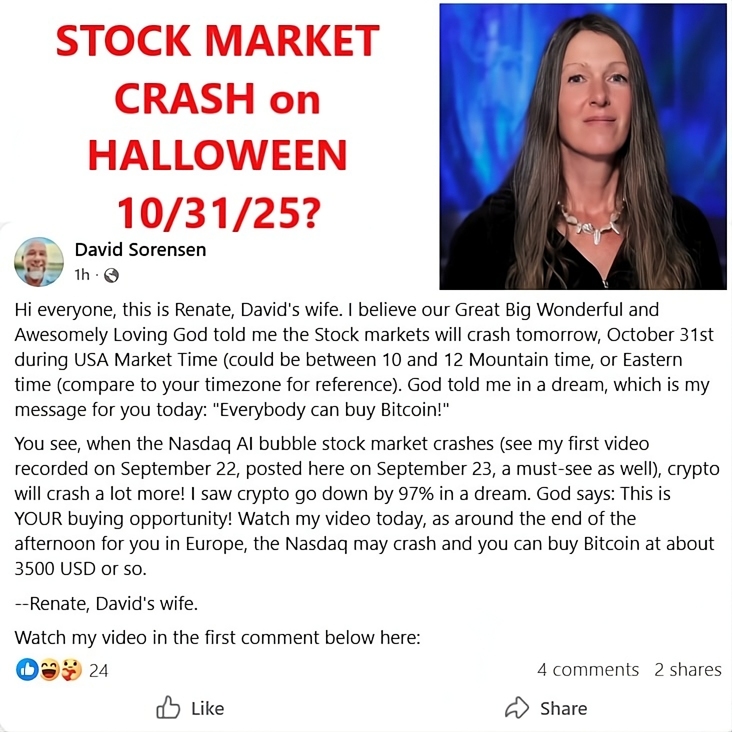 On 11/1/25 Renate Sorensen’s husband posted an update regarding the failed Halloween crash prophecy: