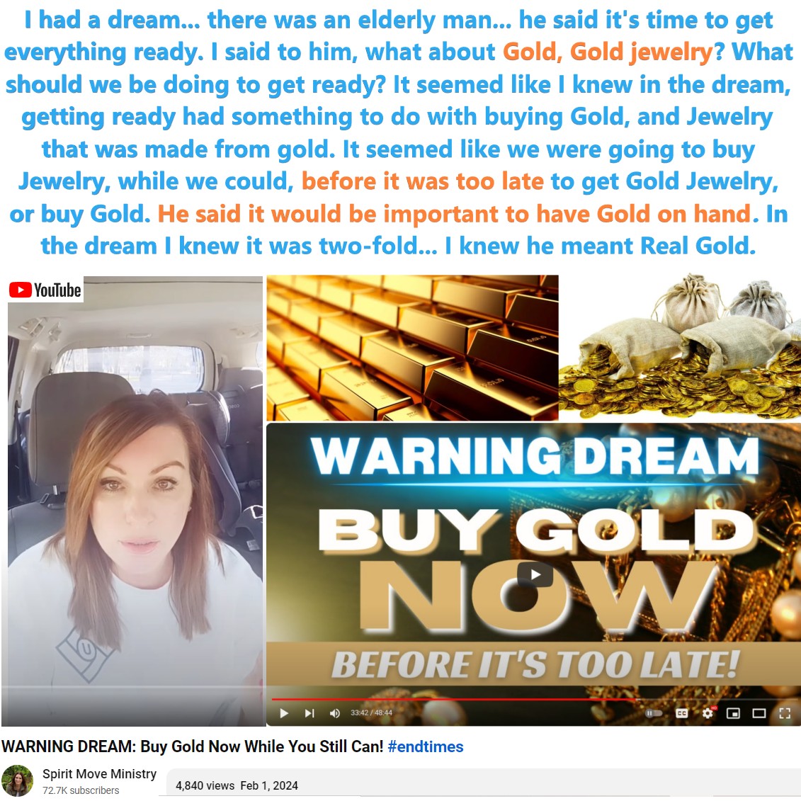this is you’ll see why this word is a spanking. it’s an end time prophetic word you guys. prophetic dream. and I said what about the gold.