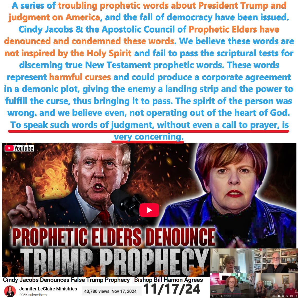 A series of troubling prophetic words about President Trump and judgment on America, as well as Leviathan and the fall of democracy have been issued. Cindy Jacobs and the Apostolic Council of Prophetic Elders have denounced and condemned these words. See partial transcript and video link below. Also see on WordPress: