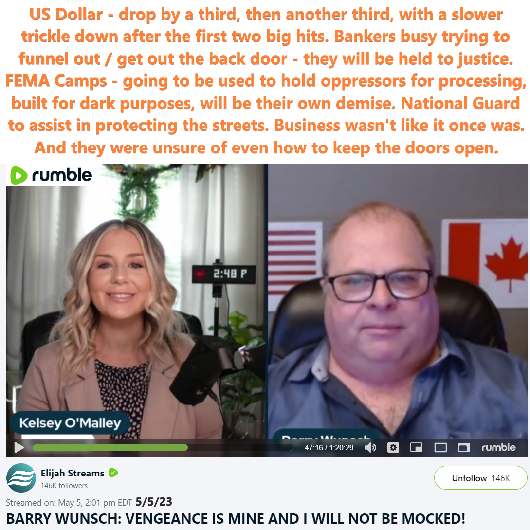 On 5/5/23 Barry Wunsch shared a new prophetic word regarding America, US Dollar, Banks, Businesses, National Guard, FEMA Camps, etc. Please see Rumble video link, Telegram Post link and transcript below.