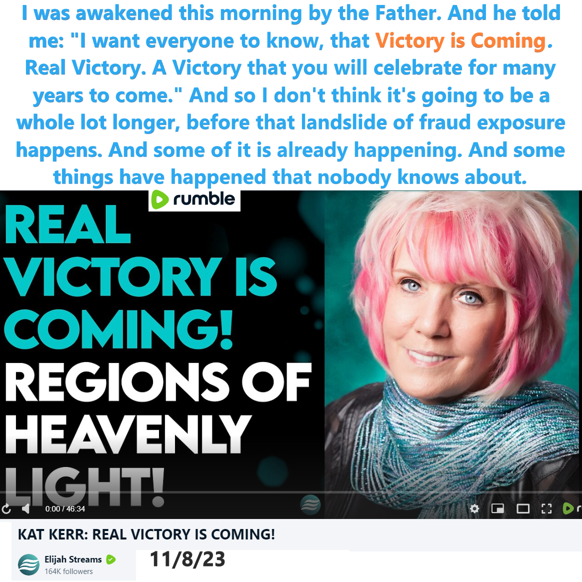 “Victory is Coming” new prophetic word shared by Kat Kerr on 11/8/23. See partial transcript and video link below: