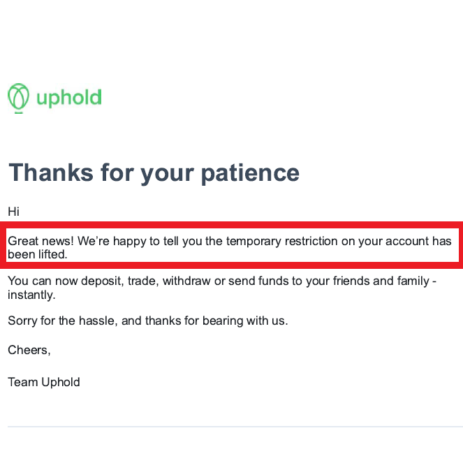 My Uphold Account Temporary Restrictions have finally been lifted (after nearly 4 weeks of waiting) – Hooray!!!