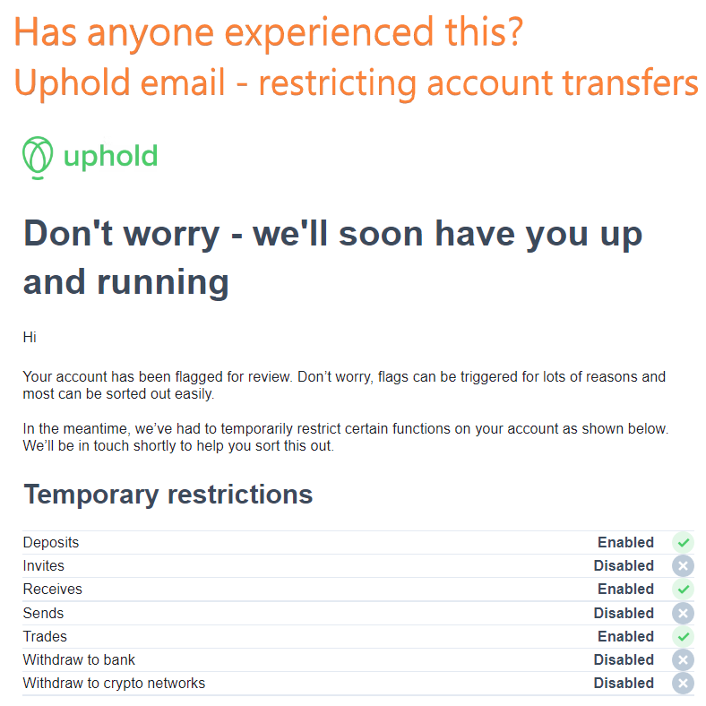 - 12/24/22 received initial email from Uphold with temporary restrictions (withdrawals not allowed)