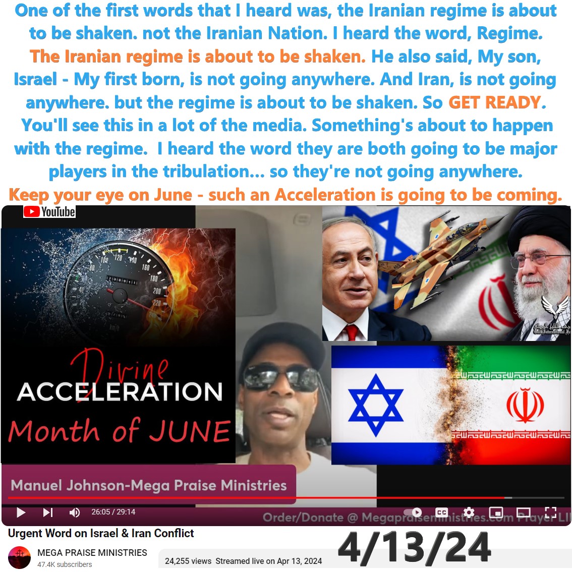 Iran prophecy by Manuel Johnson on 4/13/24. See partial transcript and video link below:
