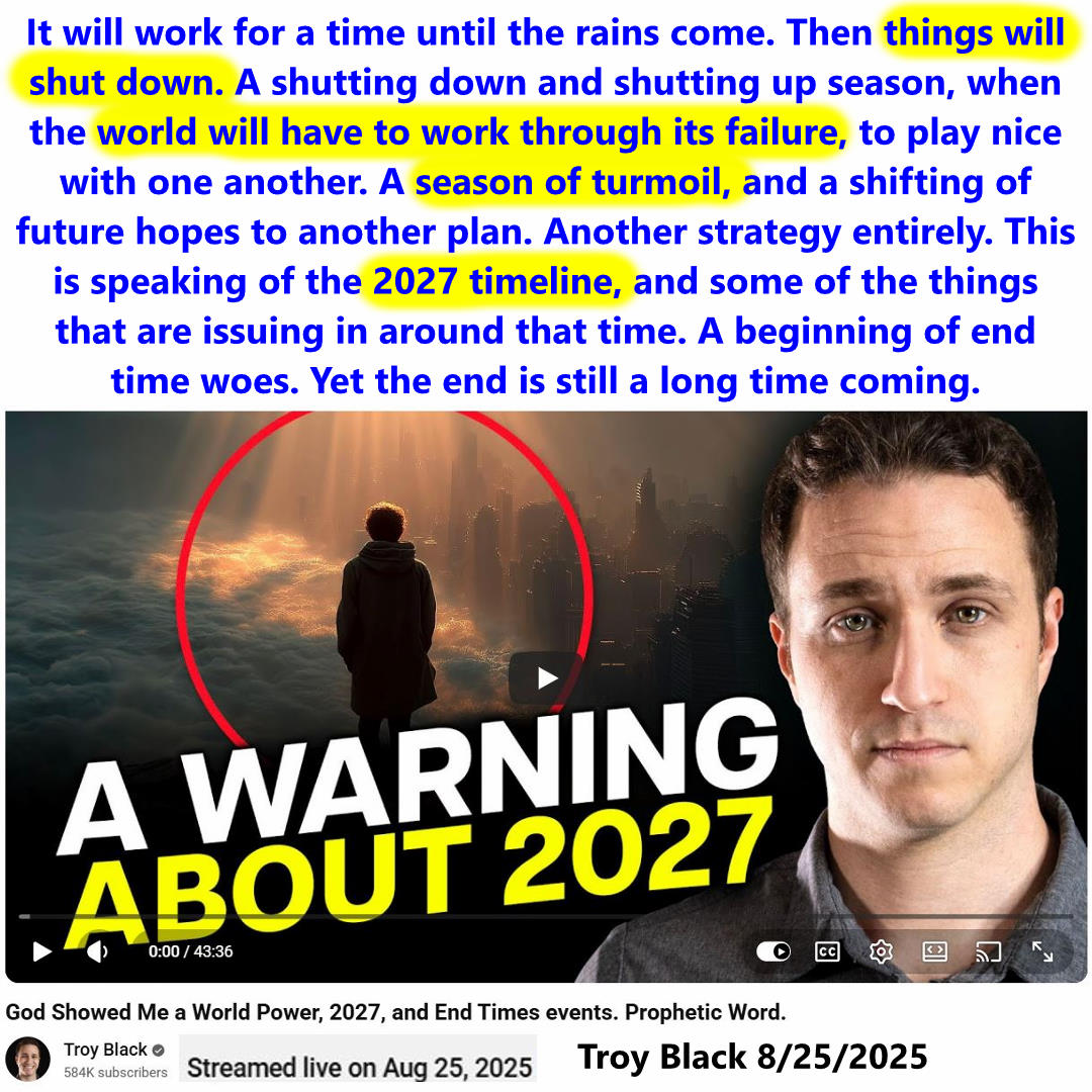Things will shut down. A season of Turmoil in 2027. Prophecy by Troy Black on 8/25/2025. See partial transcript, ai summary, and video link below: