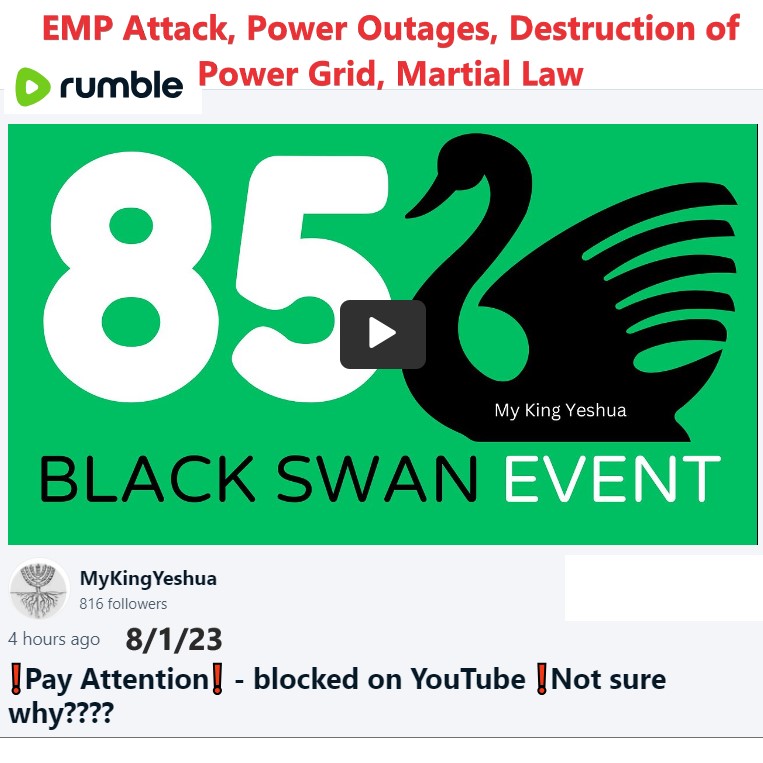 On 8/1/2023 MyKingYeshua shared a video collage regarding the coming EMP Attack and Power Outages. This video was removed by Youtube and is only on Rumble.