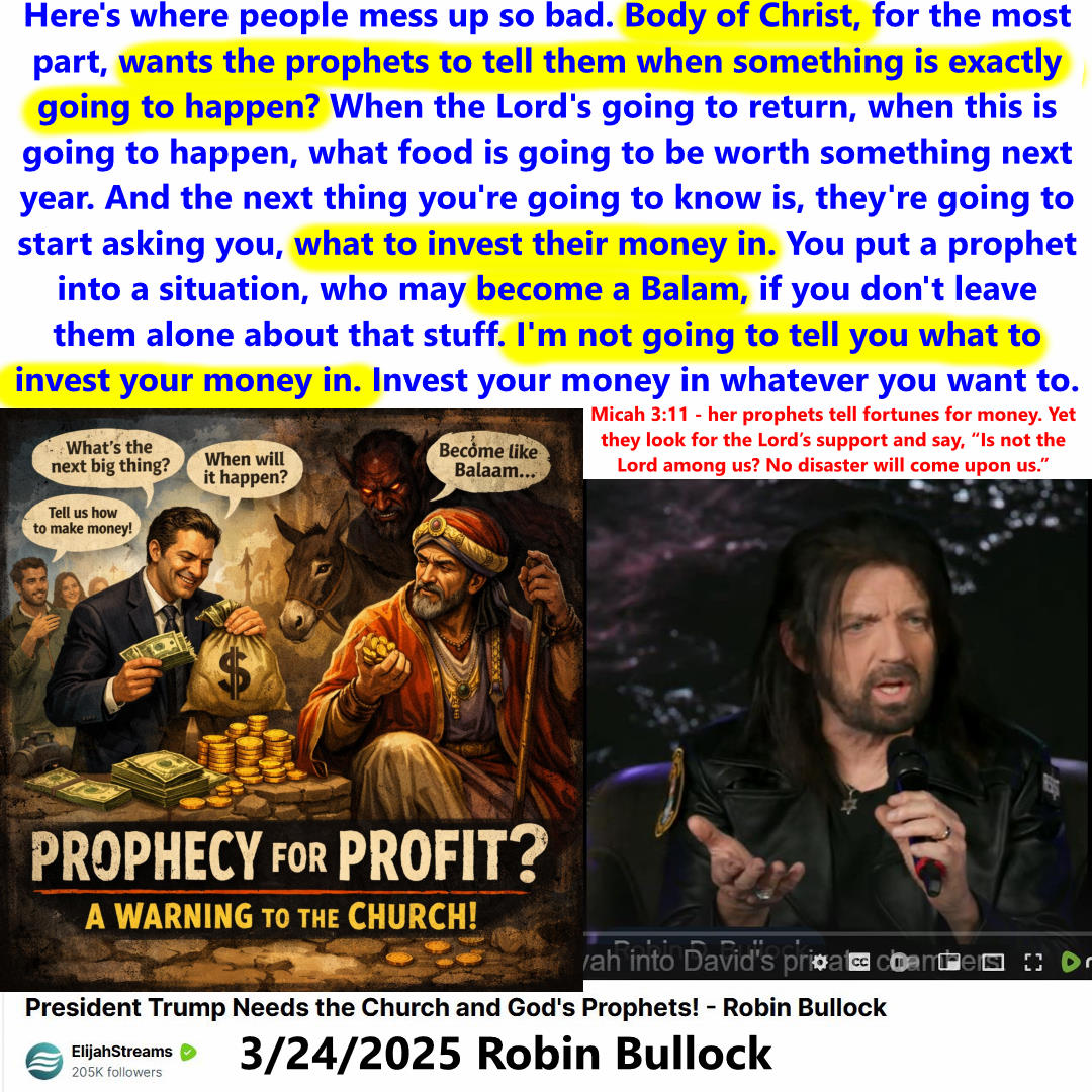 - Refusal of Financial Advising: Robin Bullock states that he will not tell people what to invest their money in. He explains that when people pressure a prophet for financial directions, it puts the prophet in a position where they may become a “Balaam,” implying a compromise of their spiritual office for financial reasons.