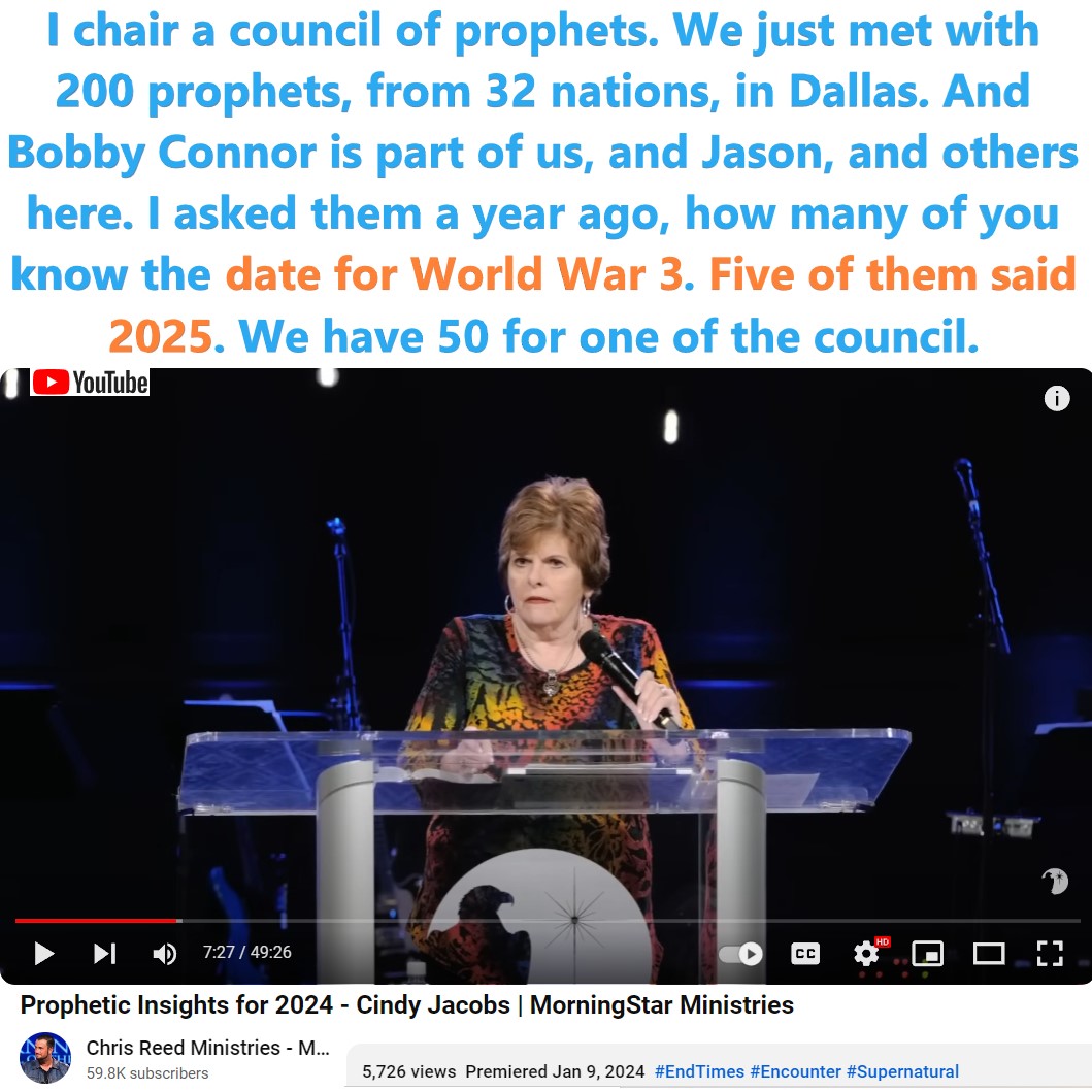 World War 3 in 2025. Cindy Jacobs provided insight into the possible timing for World War 3. See partial transcript and video link below: