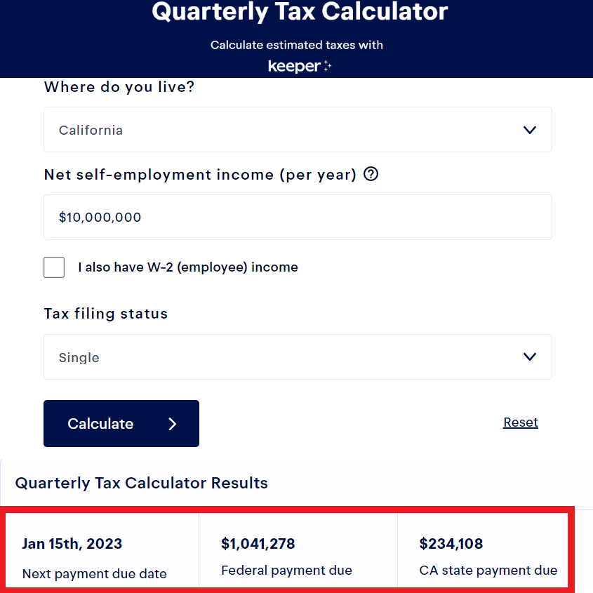 Per the Estimated Tax Calculator website/screenshot, if we make 10 million dollars in crypto and live in California, we will owe approximately $1 million dollars quarterly tax payment ($4 million total for the year) to the Federal Government and $230 thousand dollars State tax to California (so about $1 million total State tax for the year). This calculator is off a little bit because it assumes we will make our first payment on January 15 (4 quarters). But if we wait until June, we will only have 3 quarters left, so the required quarterly payment will be even higher (spread out over 3, not 4 quarters).