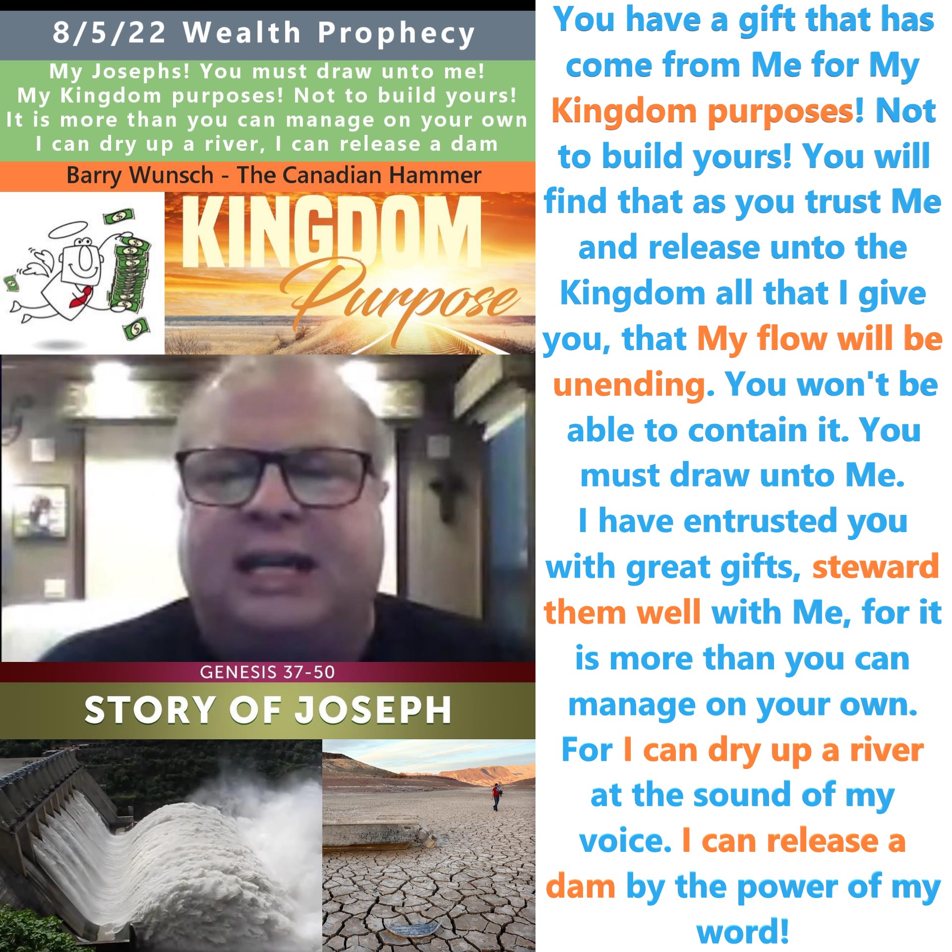 My Josephs. I know that you’ve been hurt. I know that you’ve been used. I know all that has beset you. those excuses hold water no longer. for I’ve called you. and I redeemed you. you have a gift that has come from me, for My Kingdom purposes. not to build yours. you will find that as you trust me, and release unto the kingdom all that i give you, that my flow will be unending. you won’t be able to contain it. you must draw on to me. I’ve entrusted you with great gifts. steward them well with me. for it is more than you can manage on your own. for I can dry up a river at the sound of my voice. for I’m releasing a dam by the power of my word. and I’m calling you into full surrender. for those who lay it all down, great shall be their reward. (Barry Wunsch 8/5/22)