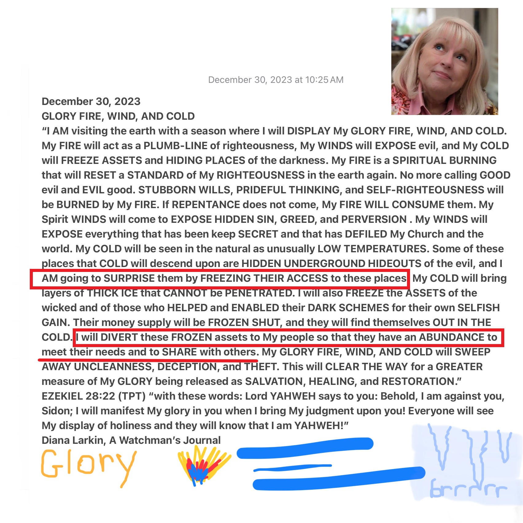 Their money supply will be frozen shut… I will Divert these Frozen Assets to My People so that they have an abundance to meet their needs and to share with others. Prophecy by Diana Larkin (A Watchman’s Journal) @awatchmansjournal
