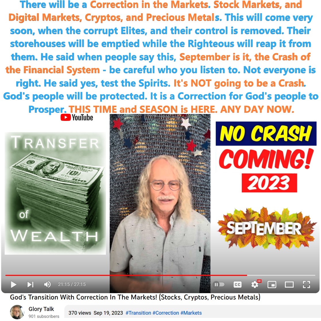 On 9/19/23 Glory Talk channel shared a new prophetic word about the Wealth Transfer and Market Correction (NO CRASH). See partial transcript and video link below: