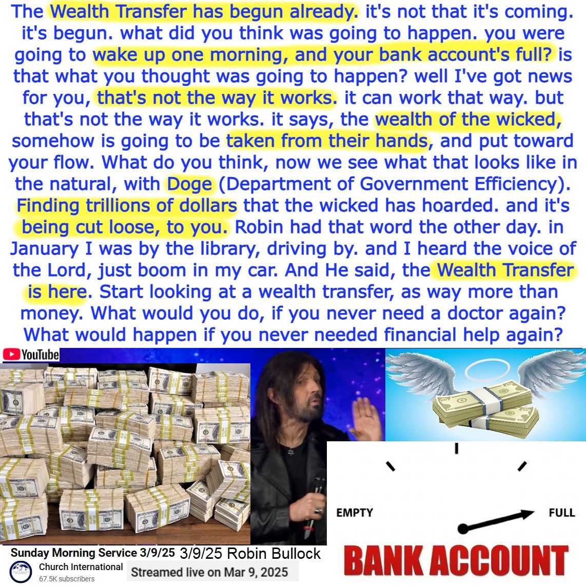 In 2029 the Church will shine. I will fix this whole thing for you. And by the time 2026 comes along, you will see the year of the fix. Fight’s coming in 2030. The Wealth Transfer has begun already. Prophecy and Teaching by Robin D Bullock on 3/9/25. See partial transcript and video link below: