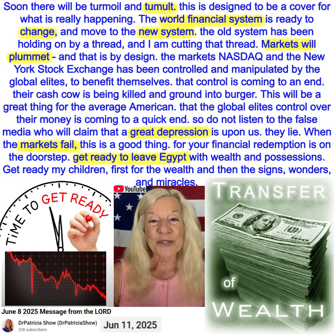 Wealth Transfer. God will use the sequence in the Bible. The world financial system is ready to change. Markets will plummet. Prophecy by Dr Patricia Show-Green on 6/11/25. See partial transcript and video link below: