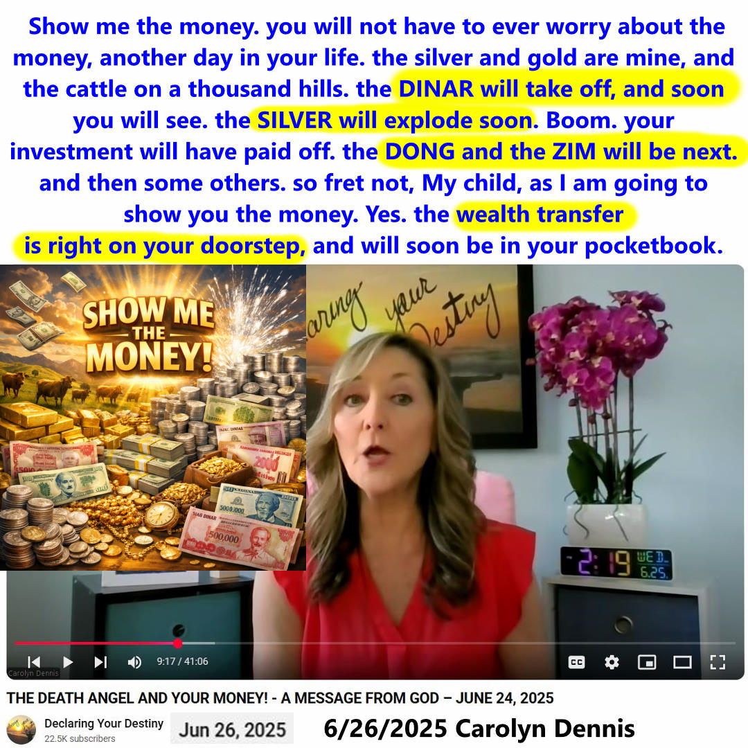 Dinar will take off and soon you will see. Silver will explode soon. Dong and Zim will be next. Wealth Transfer is right on your doorstep, and will soon be in your pocketbook. Prophecy by Carolyn Dennis on 6/26/2025. See partial transcript, ai summary, and video link below: