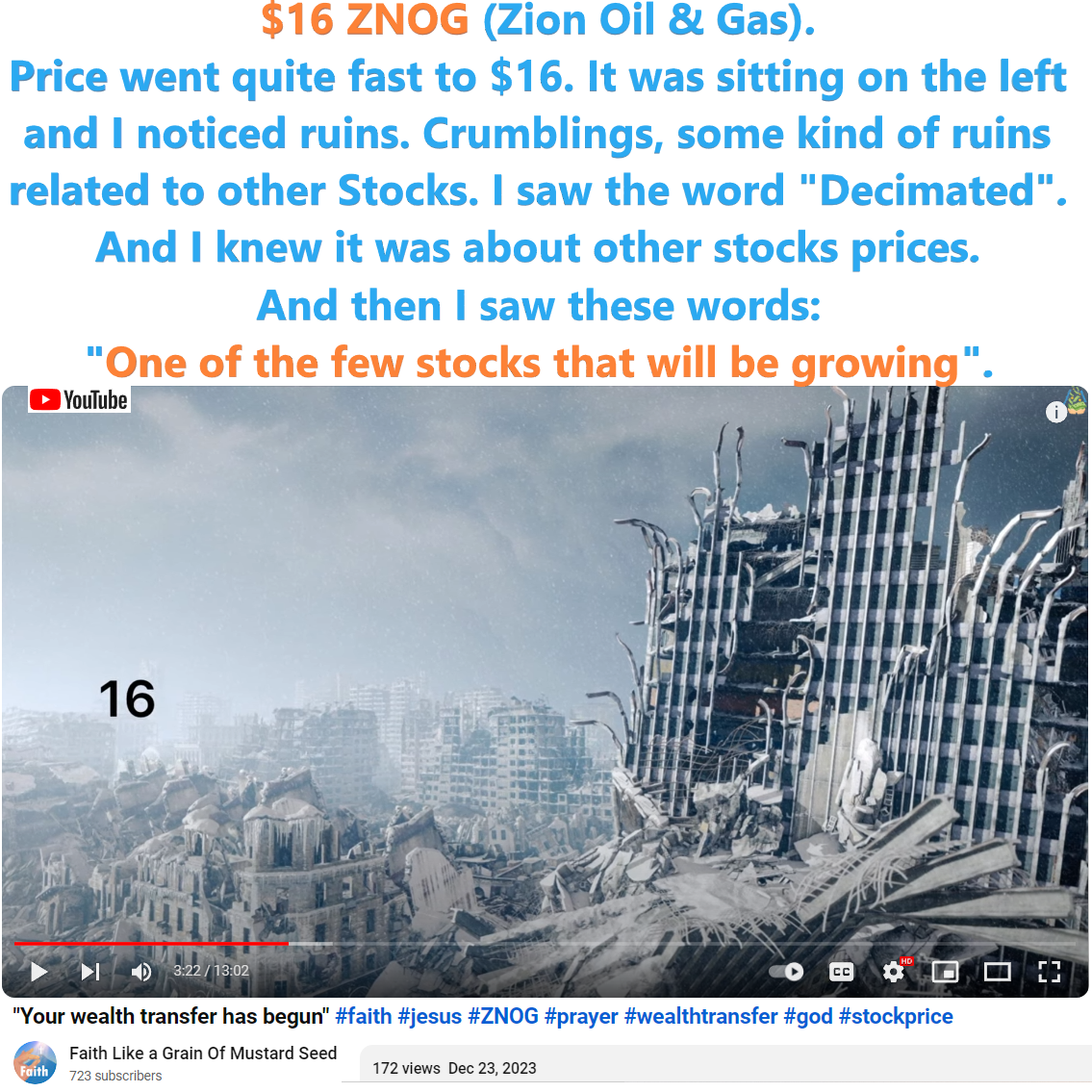 • Stock Price Vision (December 22, 2023): The speaker saw the number 16, which was understood to be a $16 price. The speaker noted that the price went “quite fast” to $16. The speaker emphasizes that ZNOG reaching $16 is “just the beginning”. The speaker also mentioned seeing a much larger number than $16 but is holding that number until further confirmation.