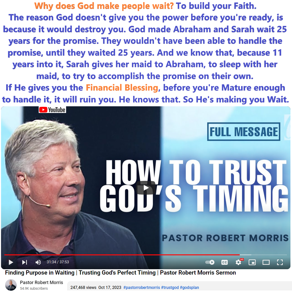 Why does God make people Wait (on the Wealth Transfer)? Teaching by Robert Morris on 10/17/23. See my summary, partial transcript, and video link below: