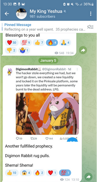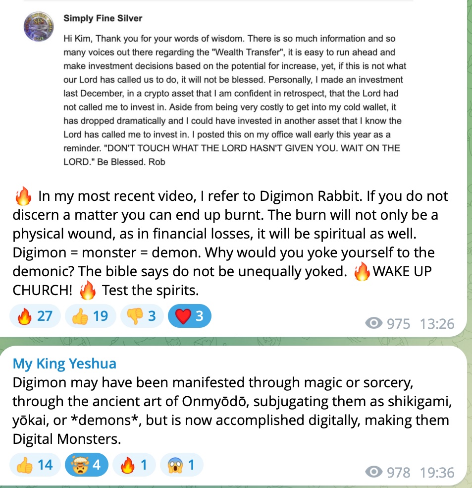 This blog post preserves Kim’s February 2023 dream where she saw coins like Digimon Rabbit and Wikicat falling away and identified them as “junk coins” to avoid. Warning that some meme‑market projects would collapse and burn investors. In 2024 we noticed lots of rug‑pull controversy around Wikicat and Digimon Rabbit, especially as it ties to Joel Ogebe’s prophecies and allegations he was involved in the Wikicat rugpull. This appears to confirm that at least one warning was directionally accurate.