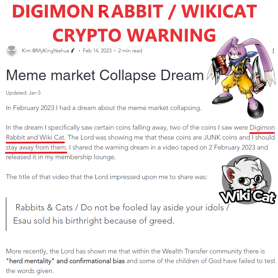 Wikicat & Digimon Rabbit Crypto Warning shared by Kim at MyKingYeshua on her Blog website on February 14, 2023. See below: