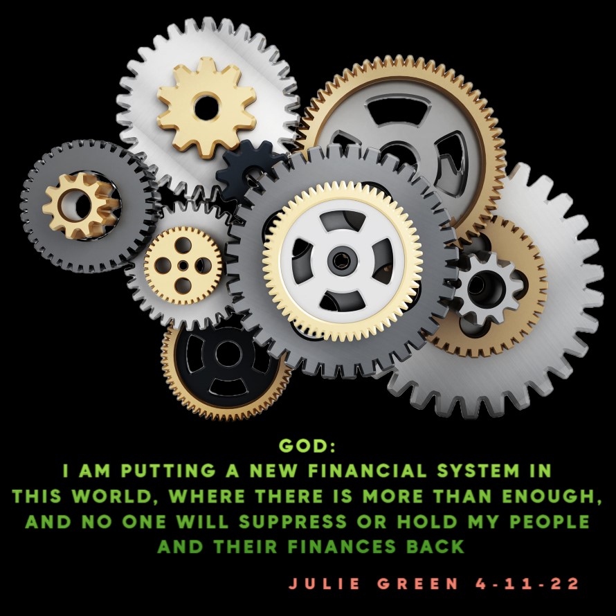 God: I am putting a new Financial System in this world, where there is more than enough, and no one will suppress or hold My people and their finances back. (Julie Green 4-11-22)