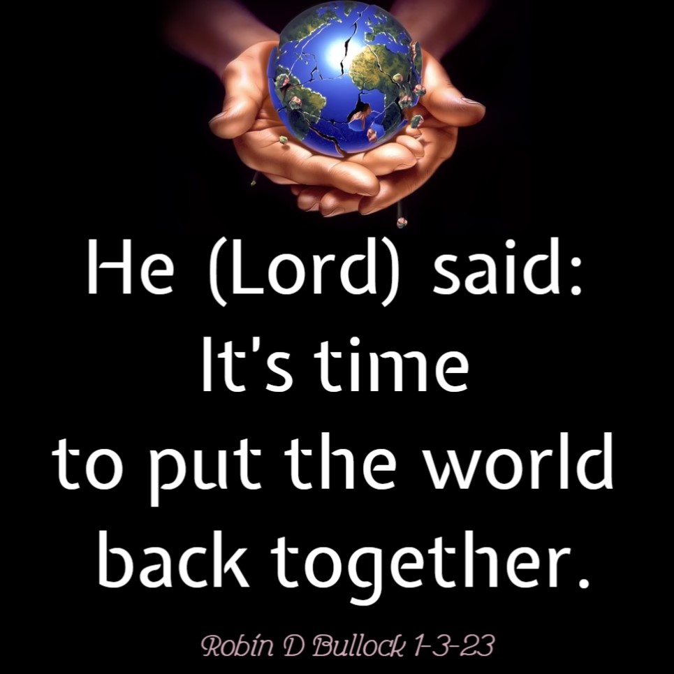 I heard the Lord say these things to me. He said: It’s time to put the world back together. I hear the Lord say: Majestic Time. (Robin D Bullock 1-3-23)