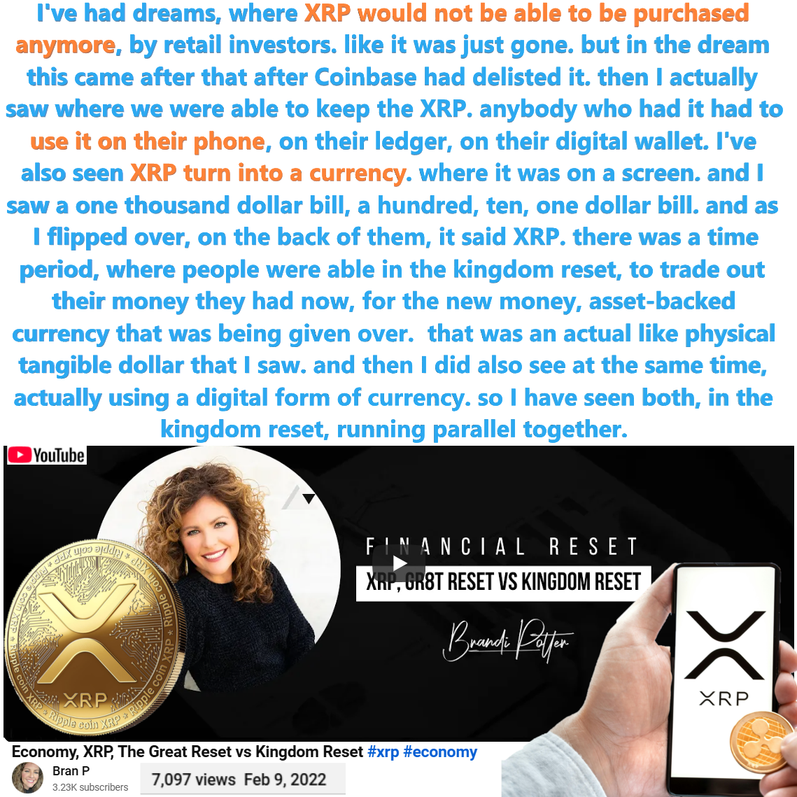 XRP would not be able to be purchased anymore, by retail investors. Prophetic Dream by Brandi Potter on 2/9/22. See partial transcript and video link below: