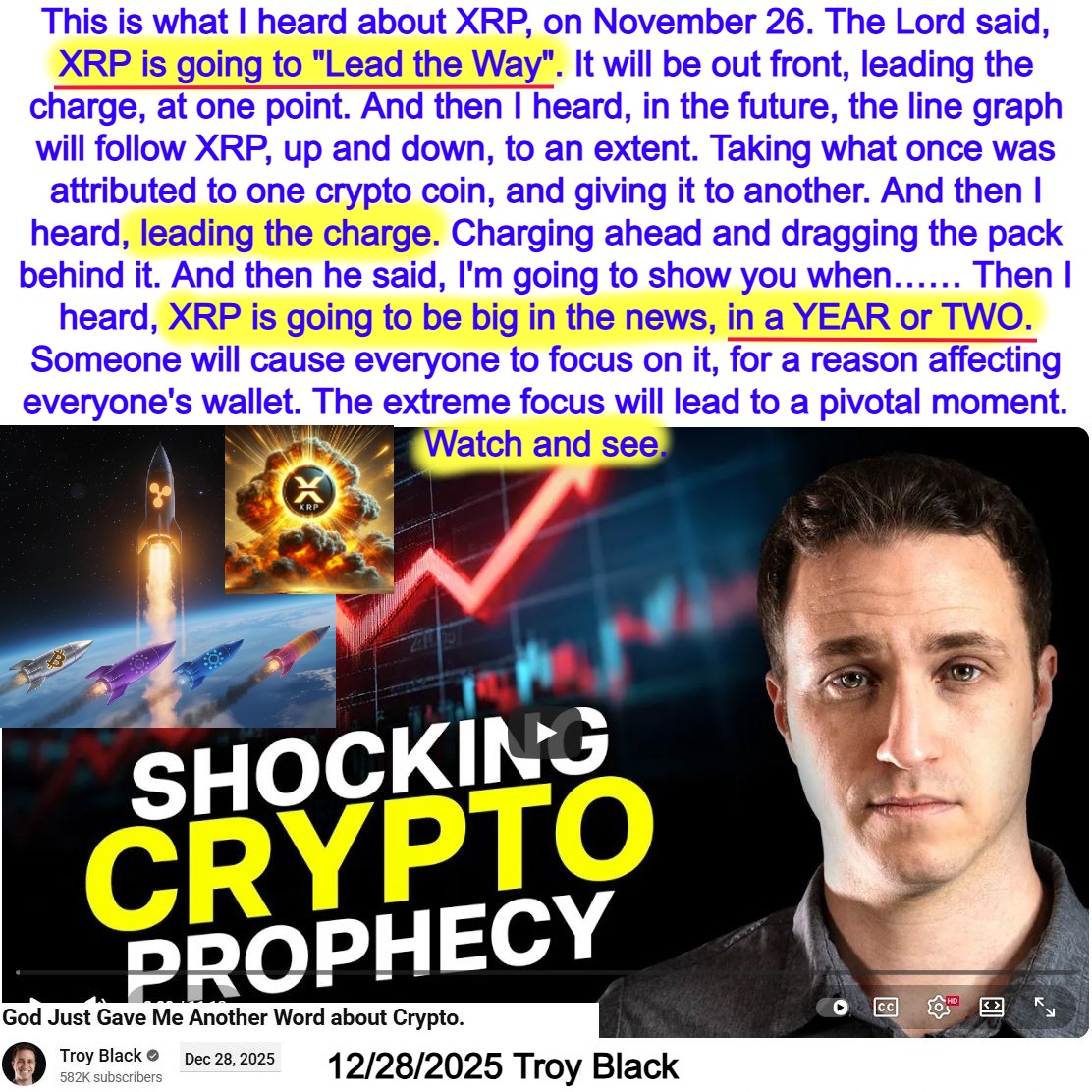 XRP is going to be big in the News, in a YEAR or TWO. Leading the Charge. Charging ahead, and dragging the pack behind it. Prophecy by Troy Black on 12/28/25. See partial transcript, AI Summary, and video link below: