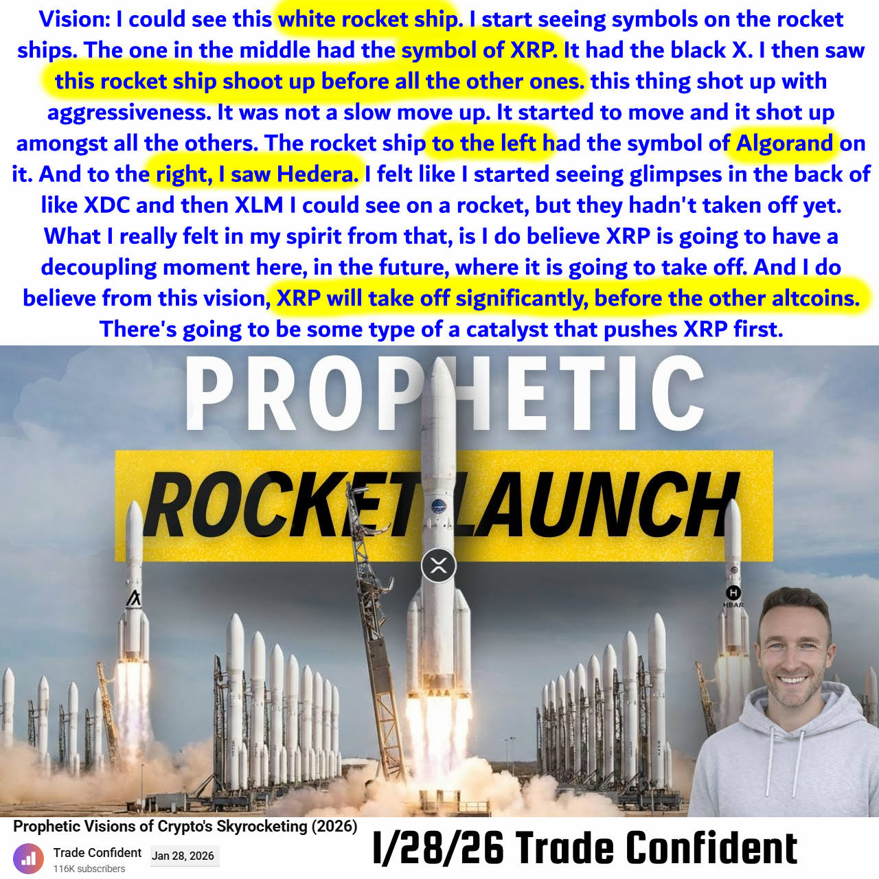 Vision: XRP rocket ship shoots up before all other ones. Then Algorand and Hedera. Prophecy by Travis (Trade Confident) on 1/28/2026. See partial transcript, ai summary, and video link below: