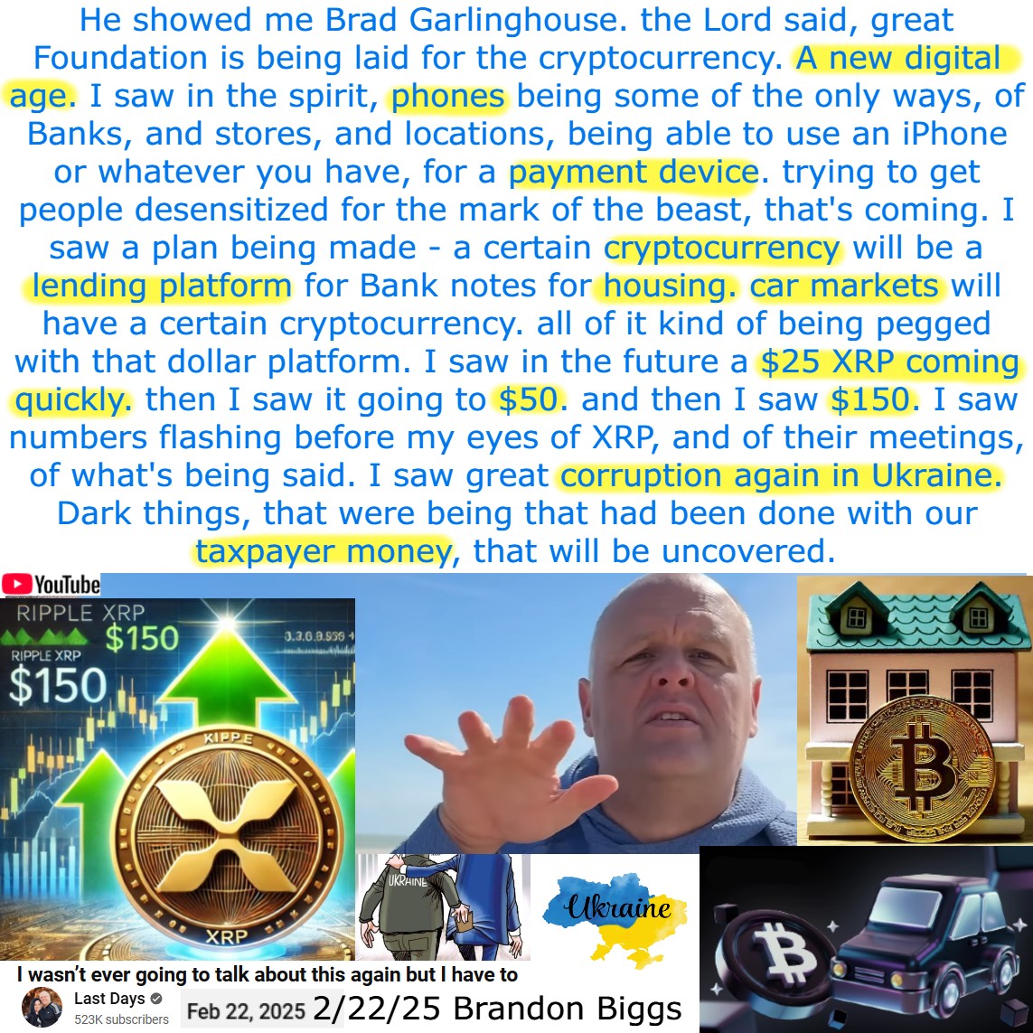 $150 XRP, Corruption in Ukraine, Phone Payments. Prophecy by Brandon Briggs on 2/22/25. See my summary, partial transcript, and video link below:
