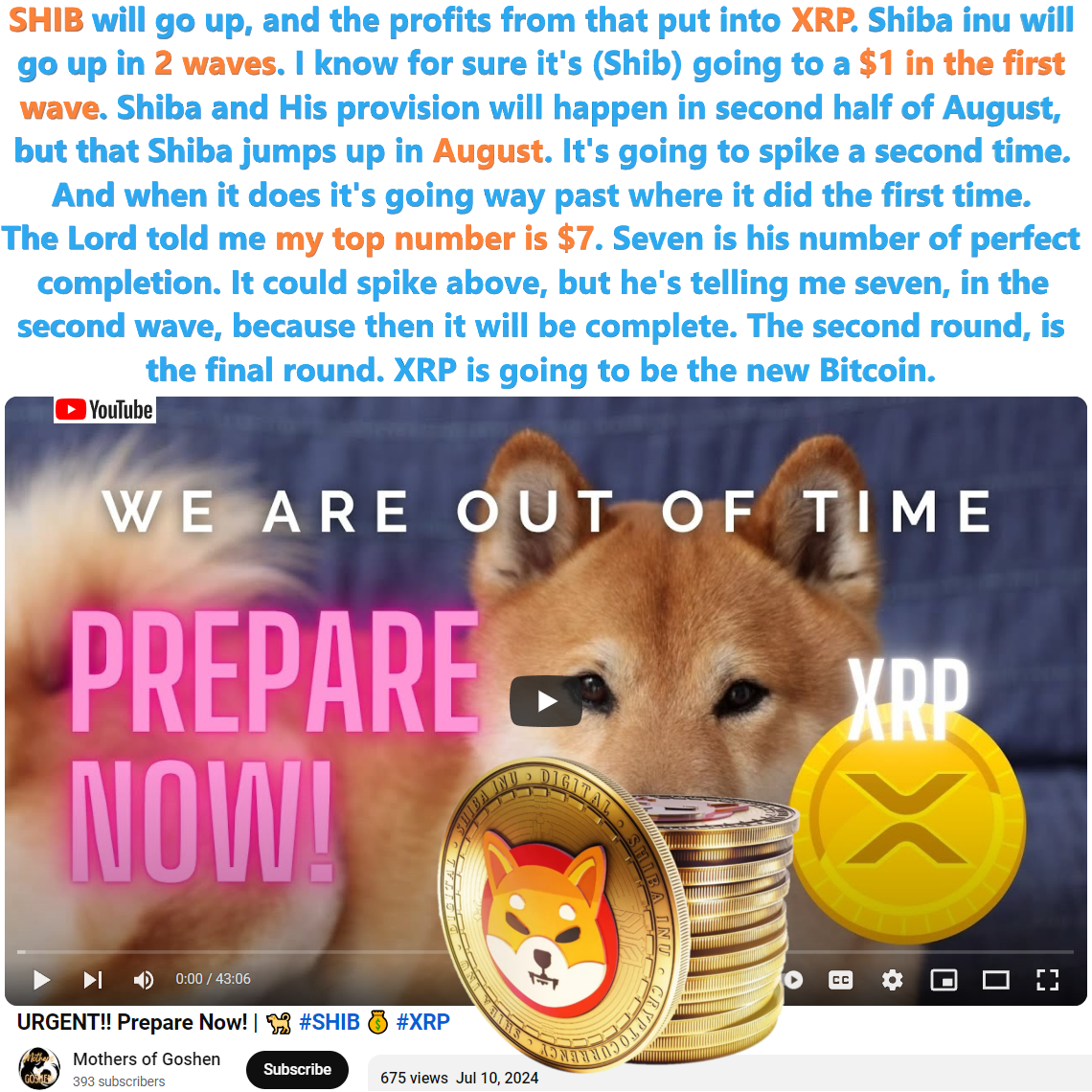 $1, $7 Shiba Inu, multiple waves, put profits into XRP, and shiba jumps in August. Prophetic word by Mothers of Goshen channel on 7/10/24.