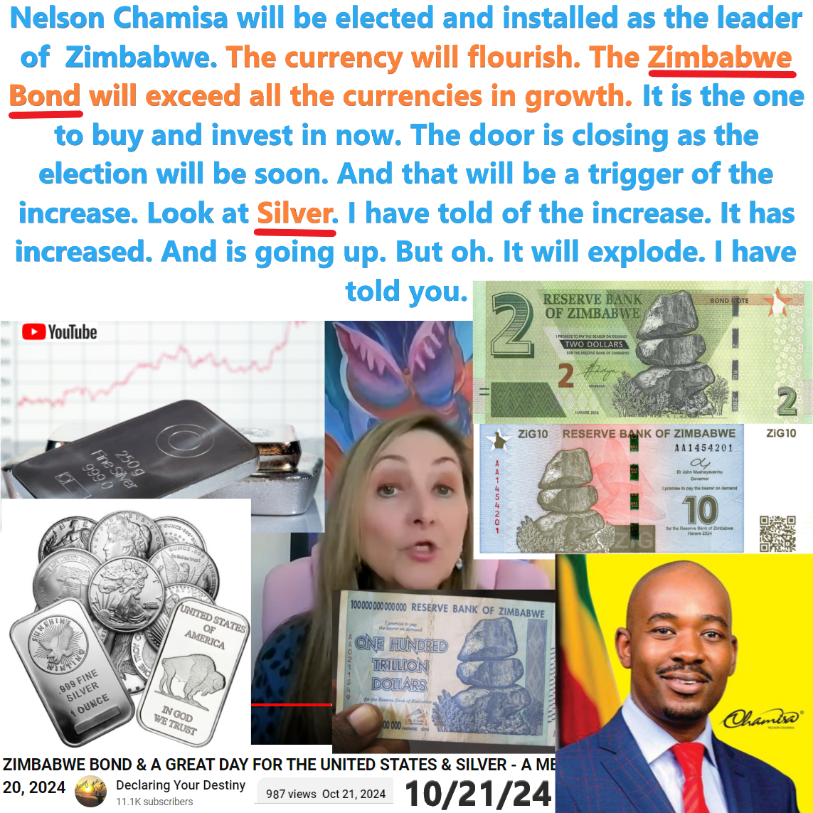 Zimbabwe Bond will exceed all the Currencies, in Growth. Look at Silver. It will explode. Prophecy by Carolyn Dennis at Declaring your Destiny on 10/21/24. See partial transcript and video link below: