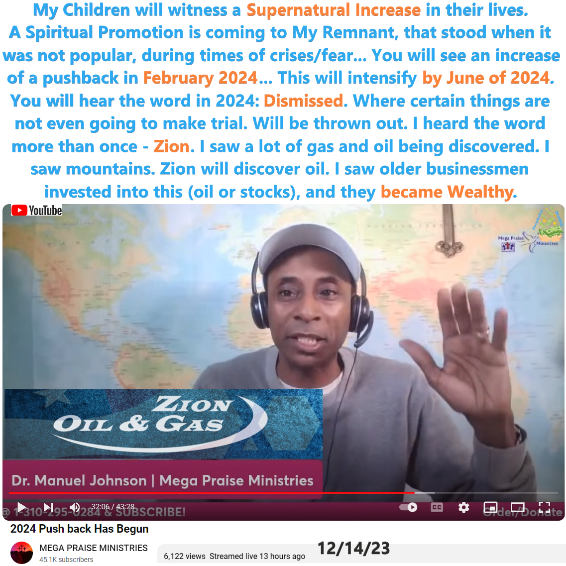 ZNOG (Zion Oil & Gas) and 2024 Prophetic Word by Manuel Johnson shared on 12/14/23. See partial transcript and video link below: